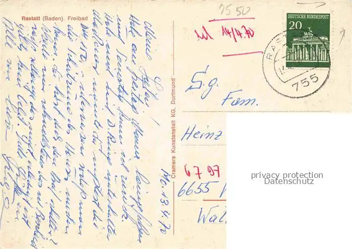 alte Postkarte RASTATT Baden BW Freibad postalisch gelaufen Erhaltung siehe scans [WerneD78]