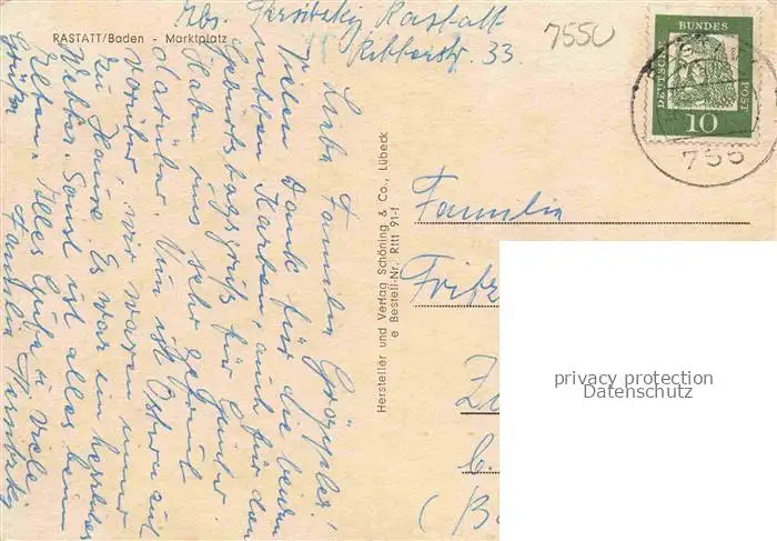 alte Postkarte RASTATT Baden BW Marktplatz postalisch gelaufen Erhaltung siehe scans [WerneD78]