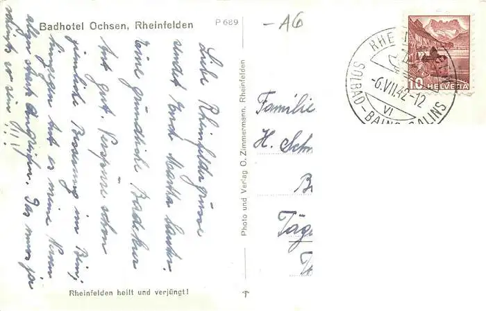 RHEINFELDEN_AG Badhotel Ochsen Rheinfelden AG postalisch gelaufen 1942 Erhaltung siehe scans [WerneD78] WernPID7