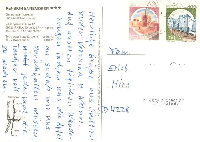 Rabland Pension Ennemoser Rabland postalisch gelaufen 1993 Erhaltung siehe scans [WerneD78] WernPID7