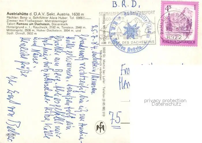 Ramsau_Dachstein_Steiermark Austriahuette Ramsau_Dachstein postalisch gelaufen 1984 Erhaltung siehe scans [WerneD78] WernPID7