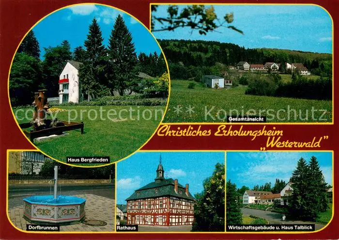 AK / Ansichtskarte Rehe_Westerwald Christl Erholungsheim Westerwald Haus Bergfrieden Dorfbrunnen Rathaus Wirtschaftsgebaeude mit Haus Talblick Rehe_Westerwald