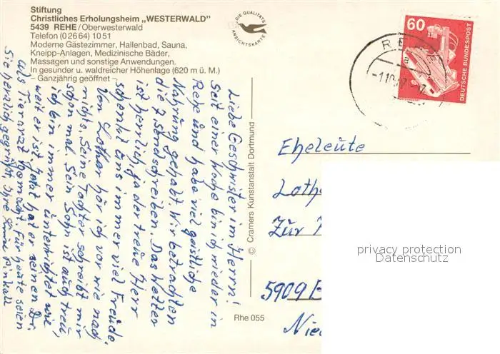 Rehe_Westerwald Christl Erholungsheim Westerwald Haus Bergfrieden Dorfbrunnen Rathaus Wirtschaftsgebaeude mit Haus Talblick Rehe_Westerwald postalisch gelaufen 1987 Erhaltung siehe scans [WerneD78] WernPID7