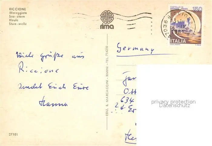Riccione Brandung Strand Hotel Riccione postalisch gelaufen 1980 Erhaltung siehe scans [KathaD81] Kathoren