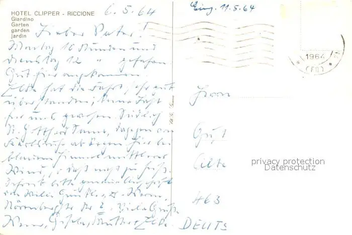 Riccione Clipper Hotel Garten Riccione postalisch gelaufen 1964 Erhaltung siehe scans [WerneD78] WernPID7