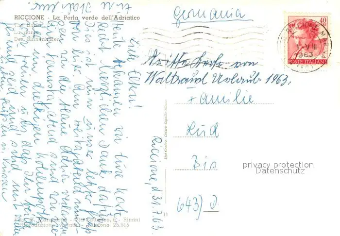 Riccione Perla v erde dell'Adriatico Riccione postalisch gelaufen 1963 Erhaltung siehe scans [KathaD81] Kathoren