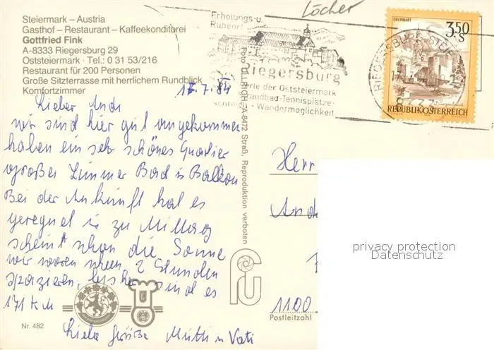 Riegersburg Gasthaus Restaurant Fink Riegersburg postalisch gelaufen 1984 Erhaltung siehe scans [LiesaD40] LiesID40