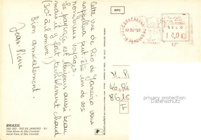 Rio_de_Janeiro Vista aérea de Sao Conrado Rio_de_Janeiro postalisch gelaufen 1987 Erhaltung siehe scans [FriedD77] Frierer