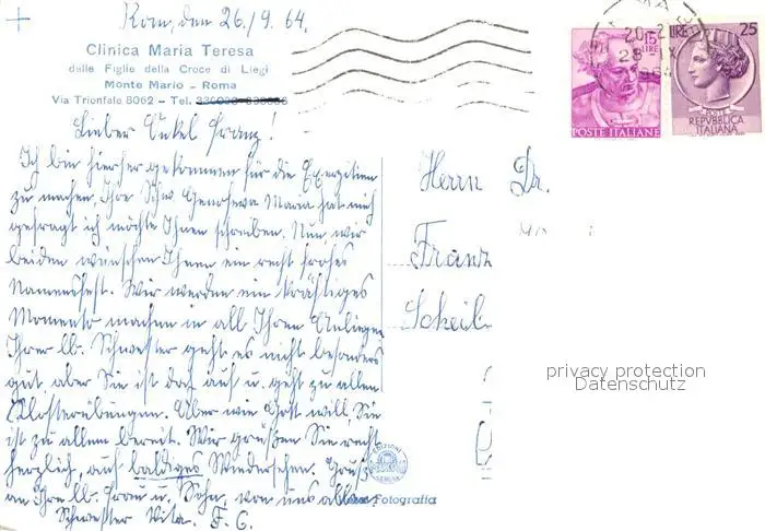 Roma_Rom Clinica Maria Teresa Roma_Rom postalisch gelaufen 1964 Erhaltung siehe scans [NatalD47] NataID47