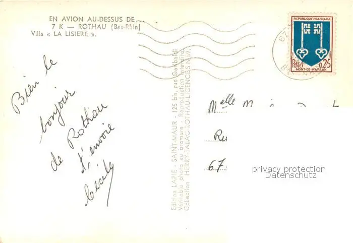 Rothau_Bas-Rhin Villa La Lisière vue aérienne Rothau Bas-Rhin postalisch gelaufen 1967 Erhaltung siehe scans [FriedD77] Frierer