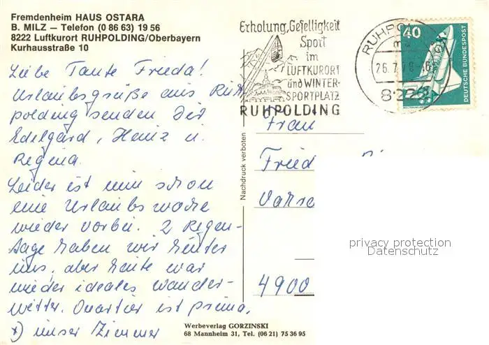 Ruhpolding Fremdenheim Haus Ostara Luftkurort Ruhpolding postalisch gelaufen 1976 Erhaltung siehe scans [FriedD77] Frierer