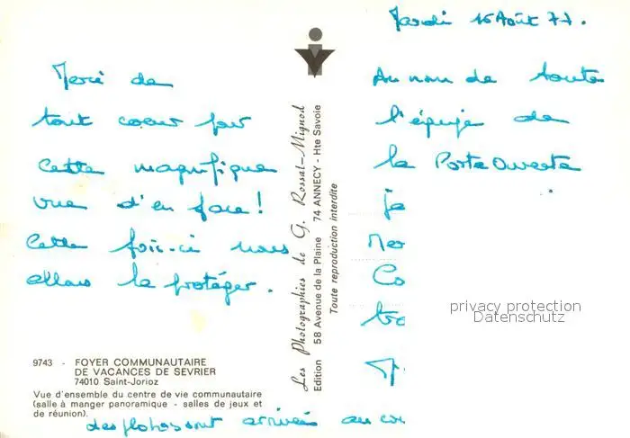 Saint-Jorioz Foyer Communautaire de Vacances de Sevrier Saint-Jorioz postalisch nicht gelaufen 1977 Erhaltung siehe scans [FriedD77] Frierer