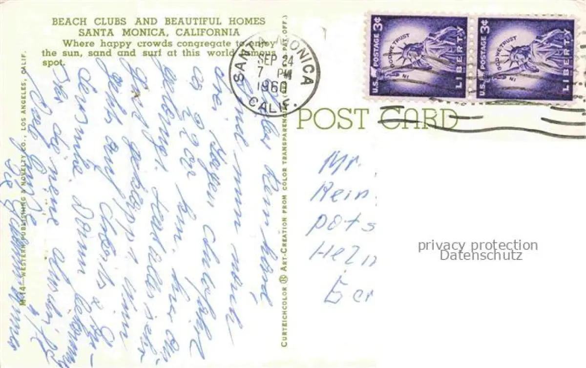 old postcard Santa Monica California USA Beach Clubs and beautiful homes postalisch gelaufen Erhaltung siehe scans [FriedD77]