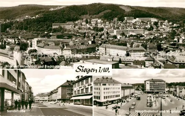 AK / Ansichtskarte Siegen_Westfalen Stadtpanorama Unterstadt Fischbacherberg Sandstrasse Hauptbahnhof Vorplatz Siegen_Westfalen