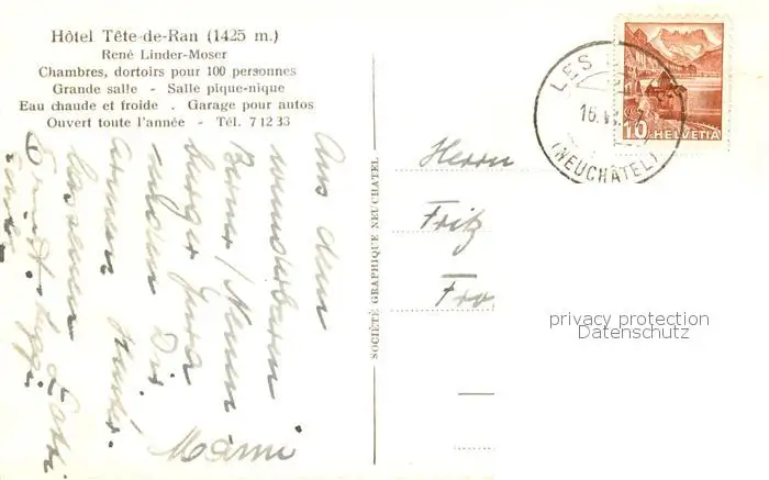 Tete-de-Ran_1422m_NE Hotel Tete de Ran postalisch gelaufen 1921-1965 Erhaltung siehe scans [WerneD78] WernPID7