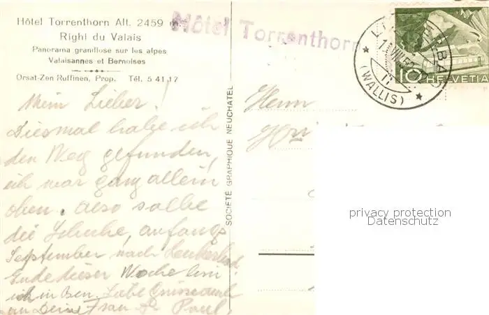 Torrentalp_2470m_Albinen_VS Hôtel Torrenthorn et les Alpes Valaisannes postalisch gelaufen 1952 Erhaltung siehe scans [FriedD77] Frierer