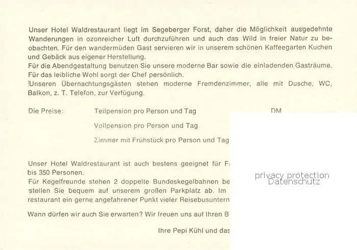 Trappenkamp Hotel Waldrestaurant Trappenkamp Kegelbahnen Zimmer Terrasse Trappenkamp postalisch nicht gelaufen nach 1965 Werbekarte (keine Postkarte) Erhaltung siehe scans [WerneD78] Werbekarte (keine Postkarte) WernPID7