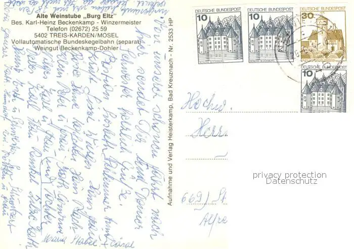 Treis-Karden Alte Weinstube Burg Eltz Gastraeume Kegelbahn Treis-Karden postalisch gelaufen nach 1965 Erhaltung siehe scans [WerneD78] WernPID7