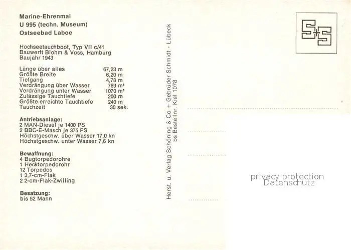 U-Boote_Unterseeboot U 995 Marine-Ehrenmal Laboe U-Boote Unterseeboot postalisch nicht gelaufen nach 1965 Erhaltung siehe scans [PaolaD17] PaolPID1