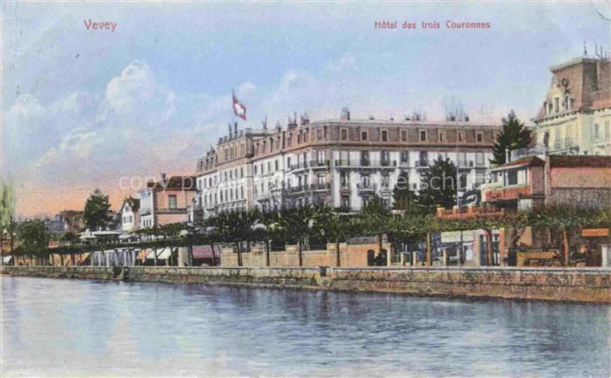alte Postkarte VEVEY VD Hôtel des trois Couronnes au Lac Léman postalisch gelaufen Erhaltung siehe scans [FriedD77]