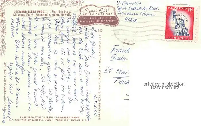 old postcard Waimanalo Hawaii USA Leeward Isles Pool Sea Lift Park postalisch gelaufen Erhaltung siehe scans [WerneD78]