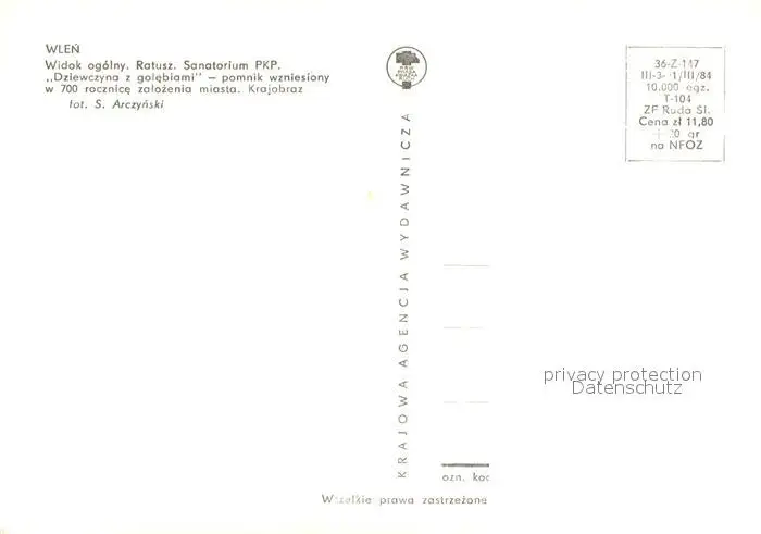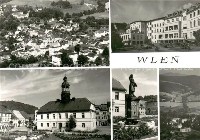 Wlen_Schlesien Kategorie Alte Ansichtskarten Postkarten kq97856 Wlen_Schlesien Widok Ogolny Ratusz Sanatorium PKP Dziewczyna z golebiami pomnik wzniesiony w 700 racznice zalazenia miasta Krajobraz postalisch nicht gelaufen nach 1965 Erhaltung siehe scans [FriedD77]