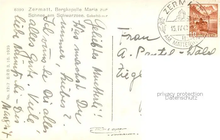 Zermatt_VS Bergkapelle Maria zur Schnee am Schwarzsee mit Gabelhoerner Zermatt_VS postalisch gelaufen 1945 Erhaltung siehe scans [WerneD78] WernPID7