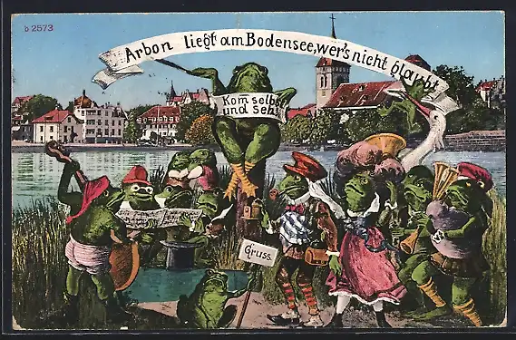 AK Arbon am Bodensee, Uferpartie mit Kirche und singenden Frösche