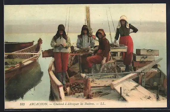 AK Arcachon, Chaland a detroquer les Huitres, Muschelfischer im Boot