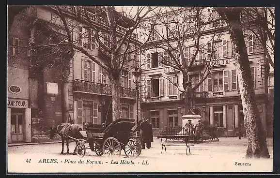 AK Arles, Place du Forum avec les hôtels et une calèche
