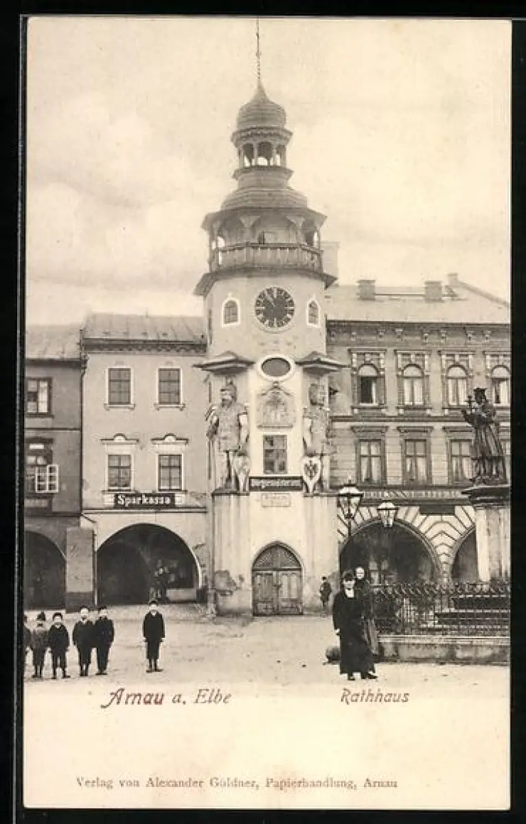 AK Arnau a. Elbe, Rathaus mit Denkmal