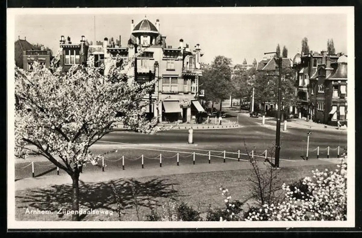 AK Arnhem, Zijpendaalseweg, Strassenpartie mit blühenden Bäumen