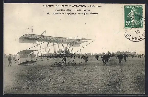 AK Arrivée de Legagneux sur biplan Farman, Flugzeug