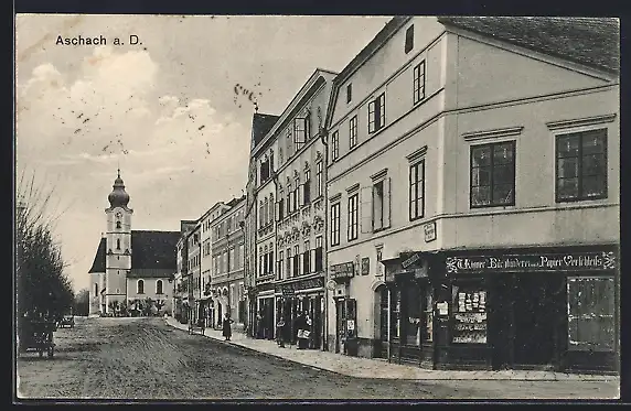AK Aschach a. D., Strassenpartie mit Geschäften
