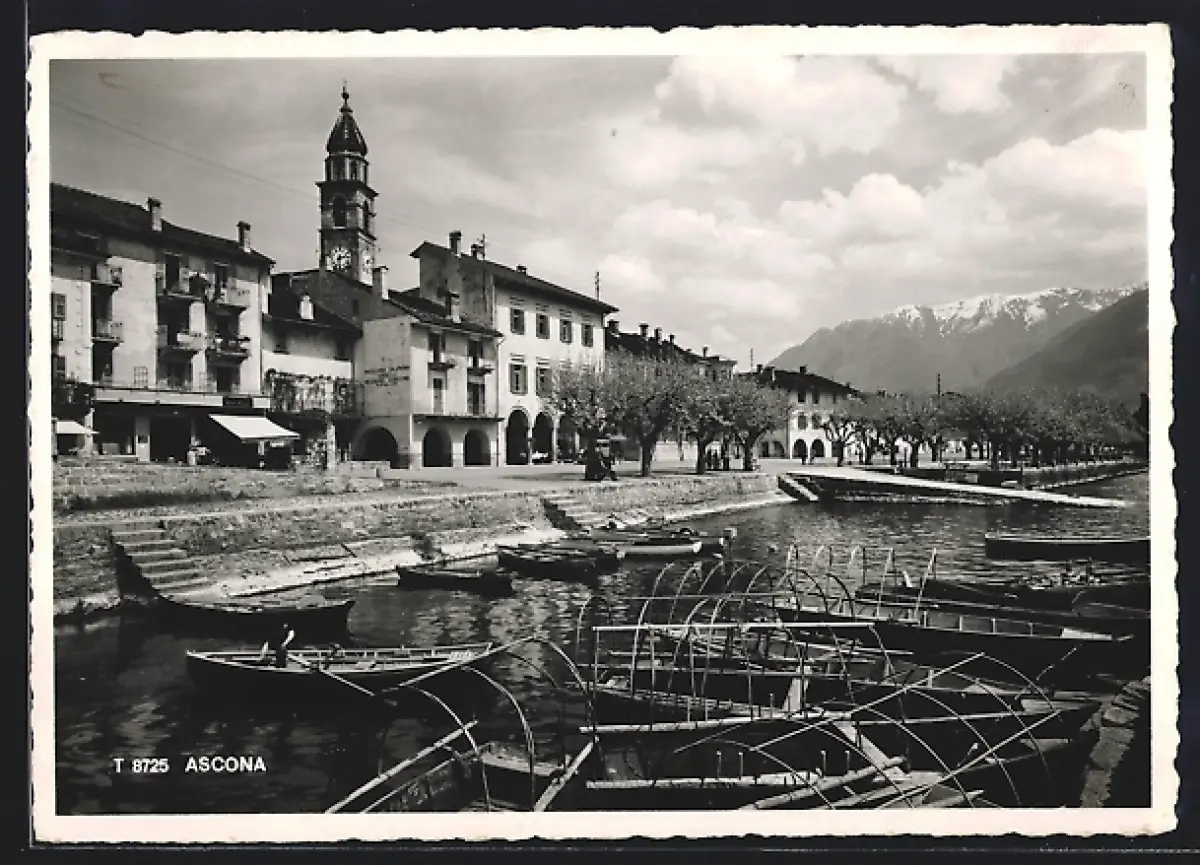 AK Ascona, Teilansicht mit Metzgerei Orelli, im Vordergrund traditionelle Boote