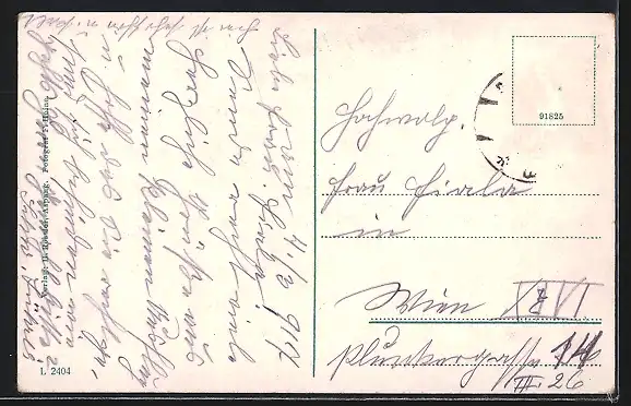 Personenbezogene Daten auf der Rückseite der Karte wurden durch blauen Textmarker unkenntlich gemacht. Die blauen Stellen sind auf die Vorderseite durchgeweicht und wirken sich negativ auf das Postkartenfoto aus