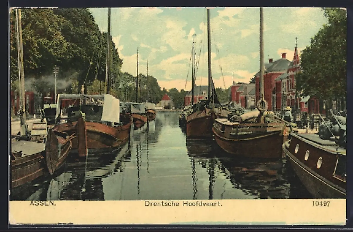 AK Assen, Drentsche Hoofdvaart, Blick den Kanal entlang mit Booten und Häusern auf der Promenade