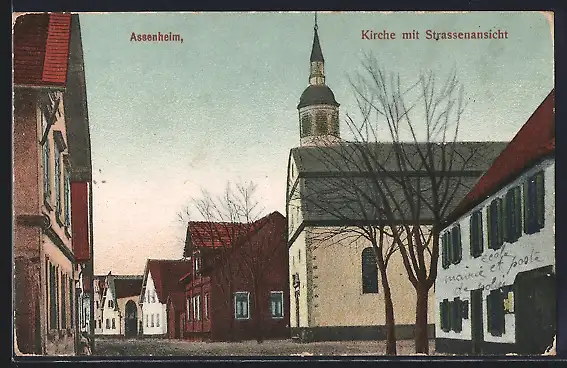AK Assenheim / Pfalz, Strassenpartie mit Kirche