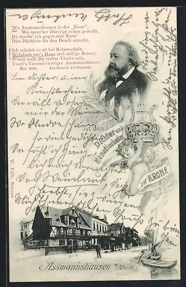 AK Assmannshausen /Rh., Gasthaus zur Kone, Ansicht mit Strasse, Portrait u. Gedicht Freiligrath