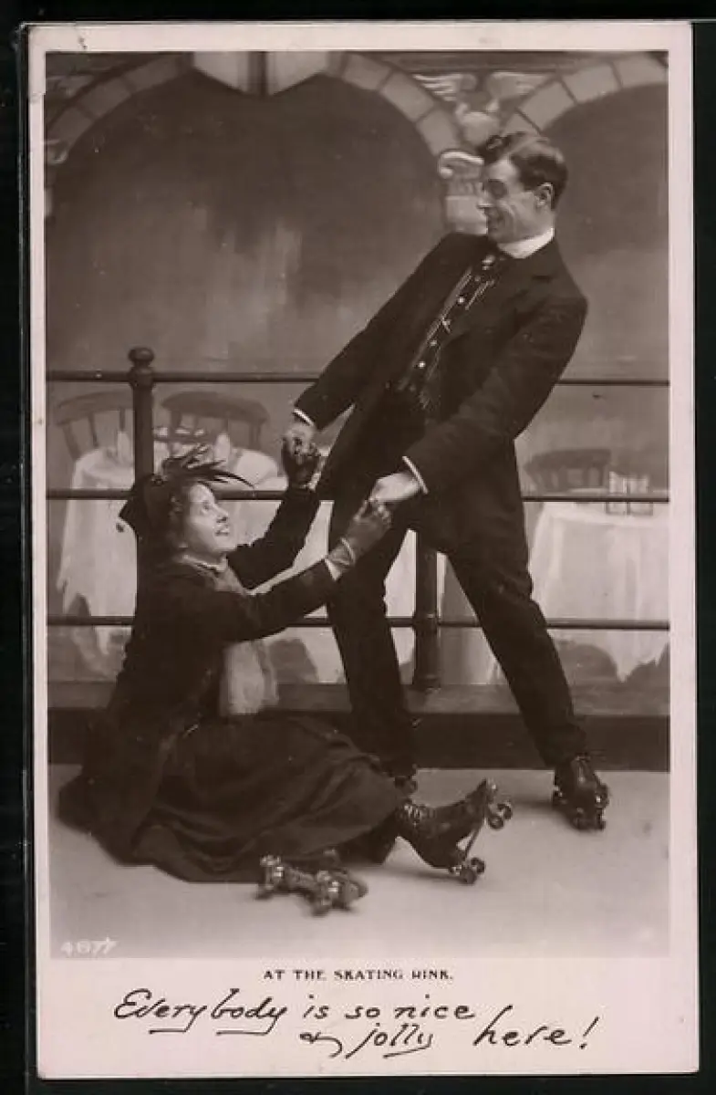 AK At the Skating Rink, Paar auf Rollschuhen stellt sich ungeschickt an