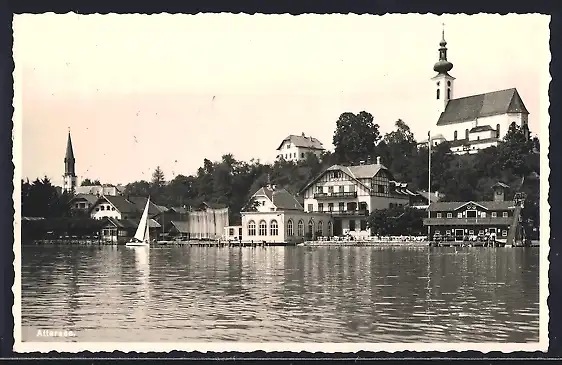 AK Attersee, Uferpanorama mit Blick auf Ort mit Kirche