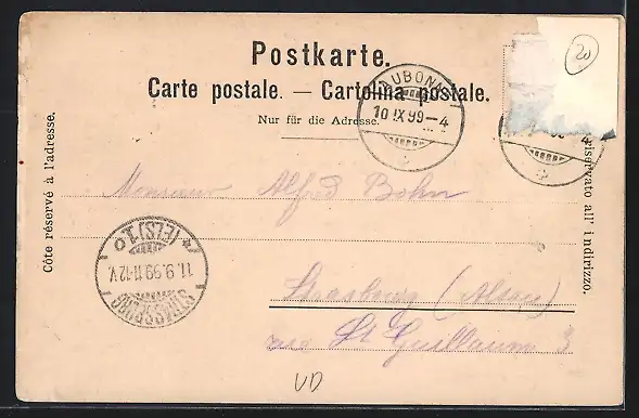 gelaufen 1899, Briefmarke entfernt, rückseitig Oberflächenschaden, guter Zustand