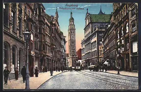 AK Augsburg, Strasse am Perlachturm und Rathaus, Strassenbahn