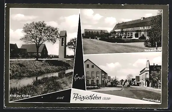 AK Augustfehn /Oldb., Hauptstrasse, Volksschule, Kanalpartie mit Kirche