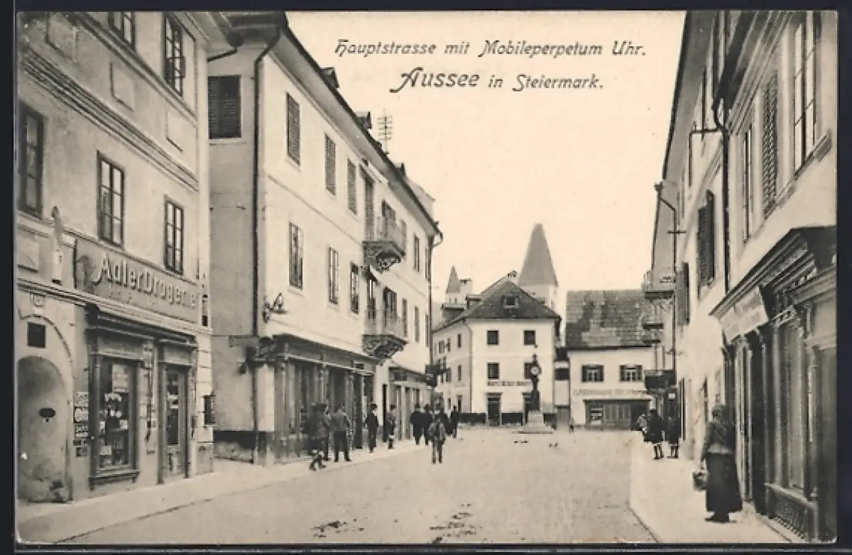 AK Aussee, Hauptstrasse mit Mobileperpetum Uhr
