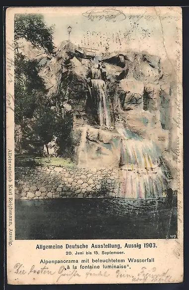AK Aussig, Allgemeine Deutsche Ausstellung 1903, Alpenpanorama mit beleuchtetem Wasserfall