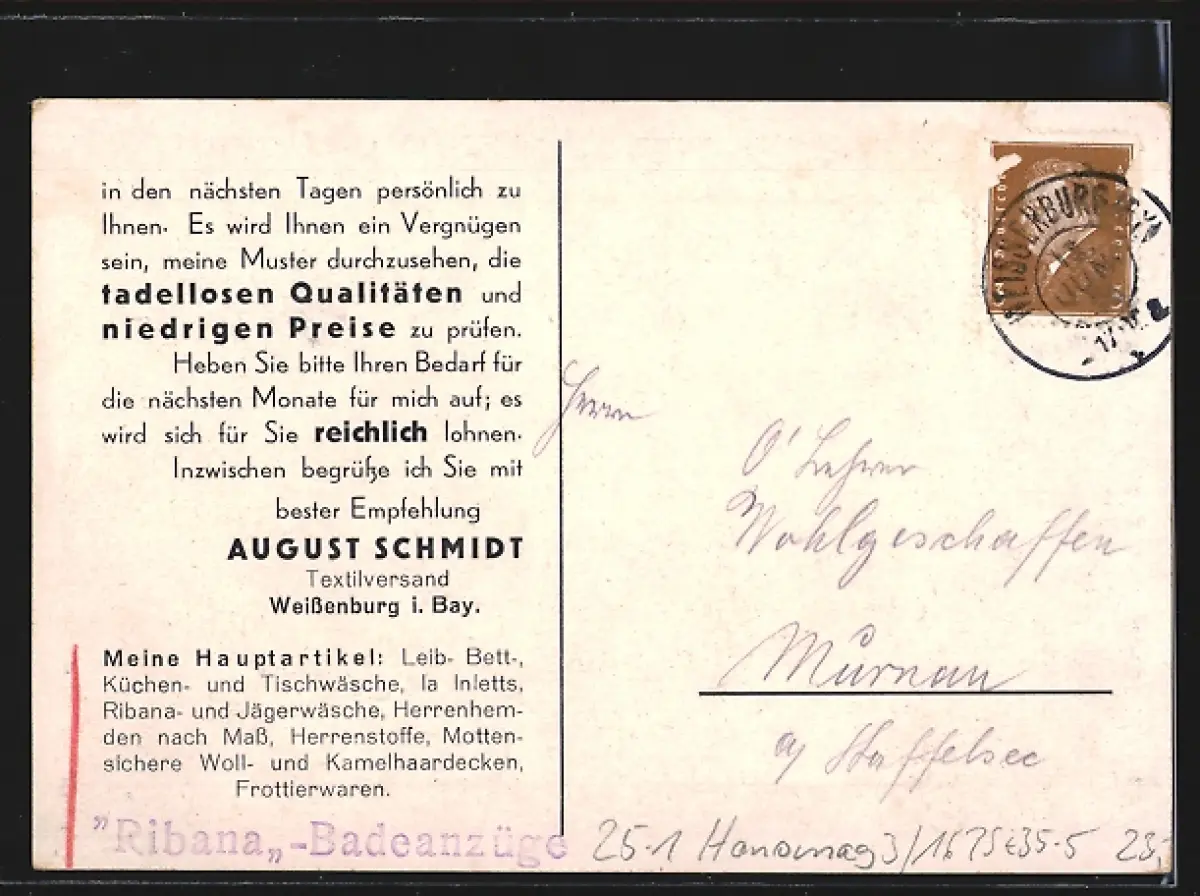 Personenbezogene Daten auf der Rückseite der Karte wurden durch blauen Textmarker unkenntlich gemacht. Die blauen Stellen sind auf die Vorderseite durchgeweicht und wirken sich negativ auf das Postkartenfoto aus