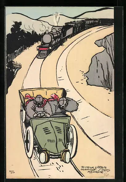 AK Auto fährt auf den Gleisen vor einer Eisenbahn davon