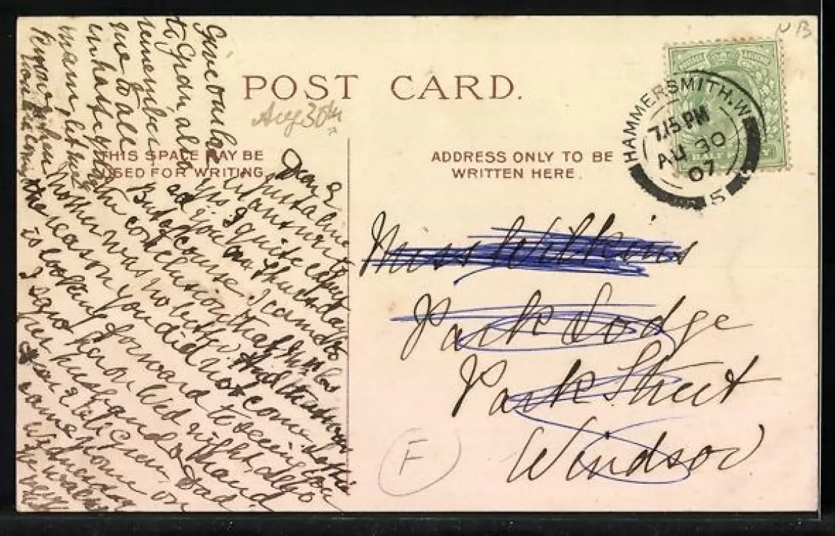 Personenbezogene Daten auf der Rückseite der Karte wurden durch blauen Textmarker unkenntlich gemacht. Die blauen Stellen sind auf die Vorderseite durchgeweicht und wirken sich negativ auf das Postkartenfoto aus