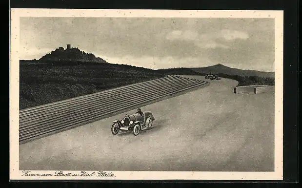 AK Autorennen auf dem Nürburg-Ring, Rennautos an der Kurve am Start- und Ziel-Platz